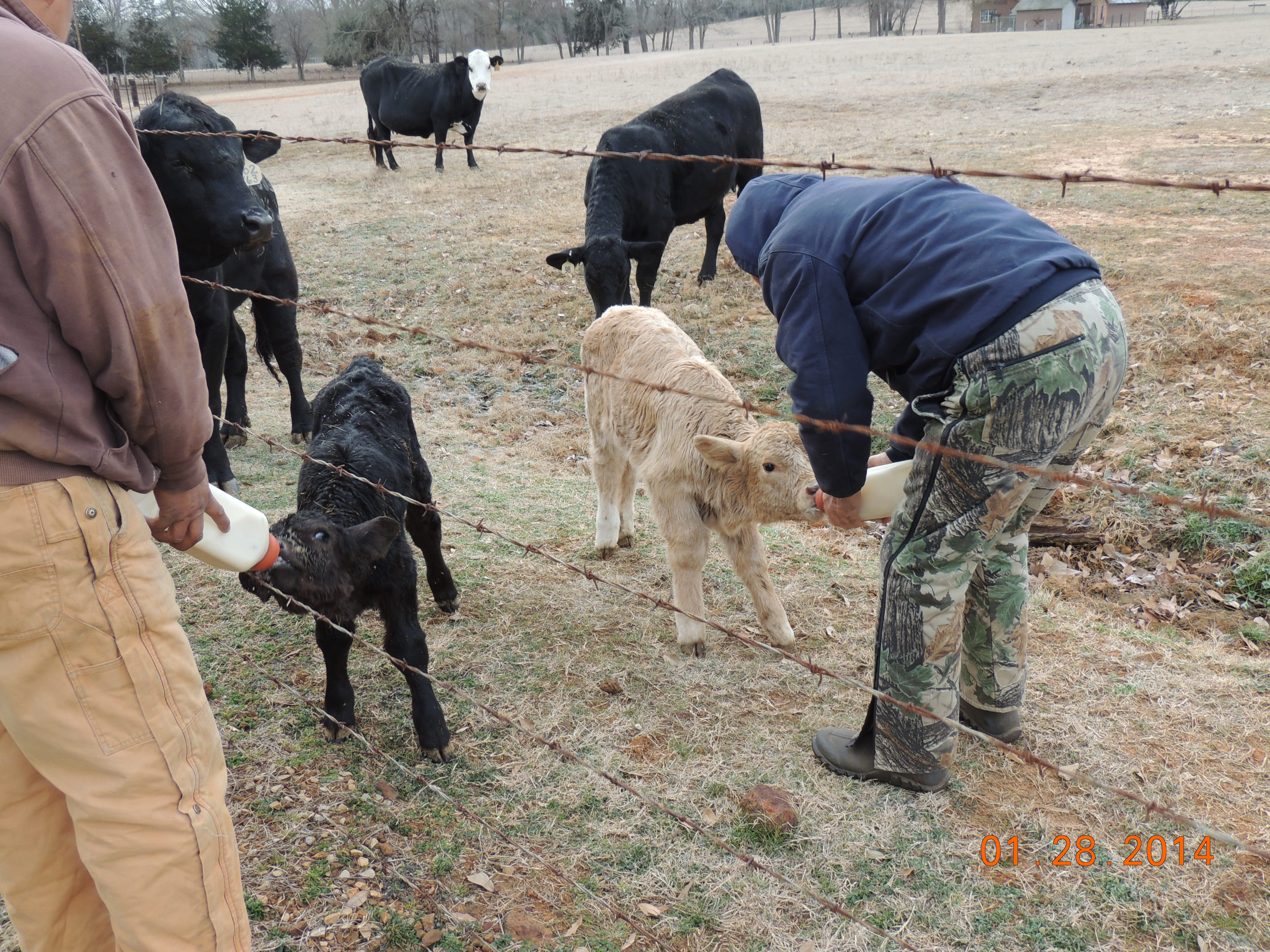 Next was Oliver – born to one of our first calf heifers. Heifers are sometimes just not ready to be a Mom so on a very cold morning we watched Oliver going from one heifer to the next stealing a little milk from each until he was noticed and kicked aside. See – that’s the deal – most cows – especially Brahman influenced cows will nurse their own calf only – one calf – their one calf only!! So we decided if Oliver was going to survive and thrive – he needed to be rescued – Rescue #2. Got him to the barn – bottle fed him – went to the barn the next morning – Cow 333 had her calf, Rescue #1, and now Rescue #2 (Oliver) nursing – ALL AT ONE TIME!! The cold winter wore on. We had one calf abandoned with pneumonia #3, one colic (never heard of it in cattle but this little guy was suffering) #4, one calf’s momma was old and stopped giving adequate milk #5, one little guy’s momma went down in her back #6. All these calves were brought to the barn – Cow 333 took them ALL plus hers – SEVEN CALVES!