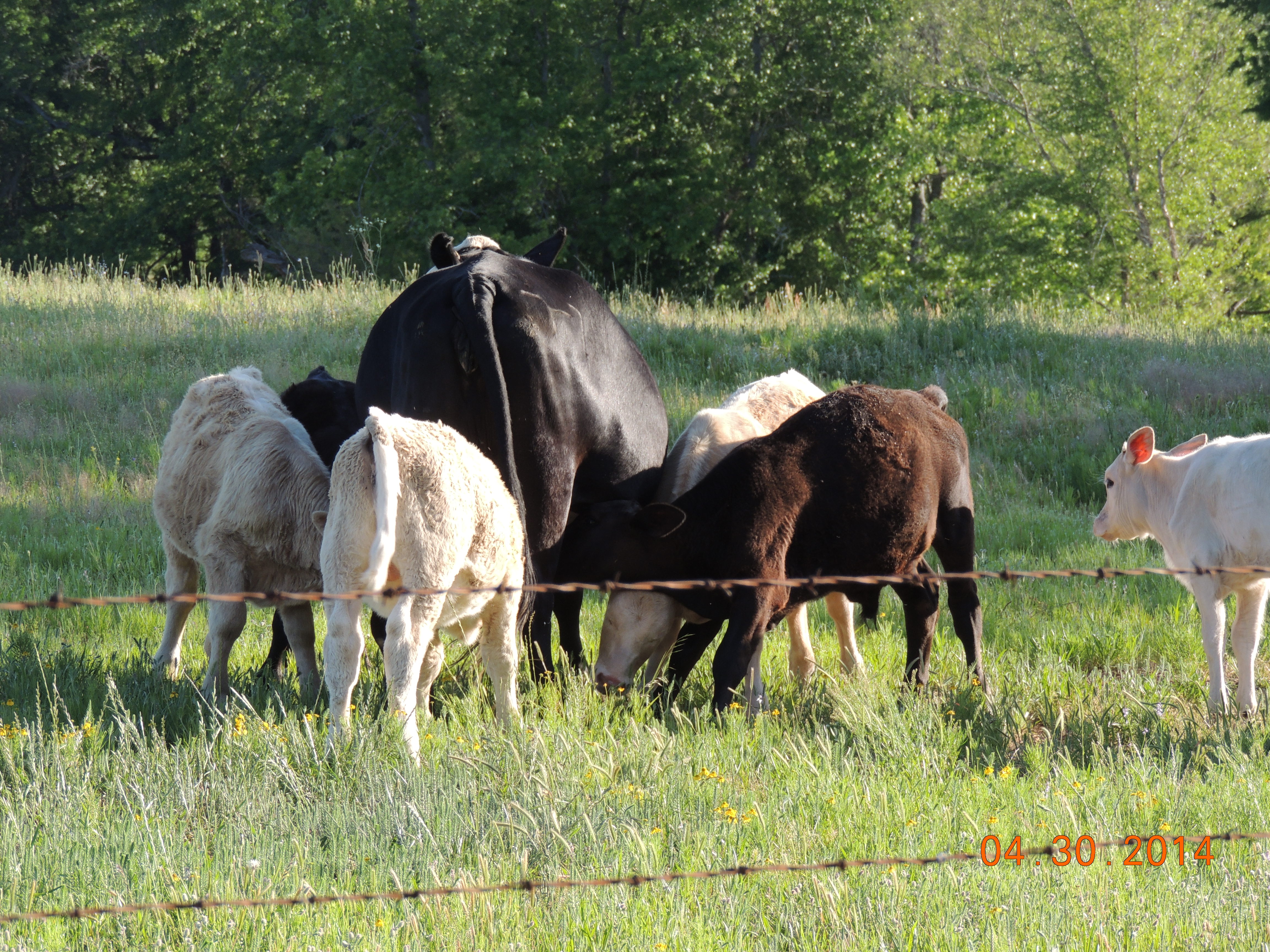 watch. 4 calves would be nursing – 3 in line waiting their turn(above right photo). If one calf went off – she would call it back. They move around the pasture in one little herd. In fact, the other day we were working cattle – 5 of the calves got through the fence and went with the herd. I was thinking about how we were ever going to get them all separated and back. No need to worry – cow 333 ran to the fence and called her brood back. I just opened the gate and she stood bellowing to them to return immediately and they did just that!!