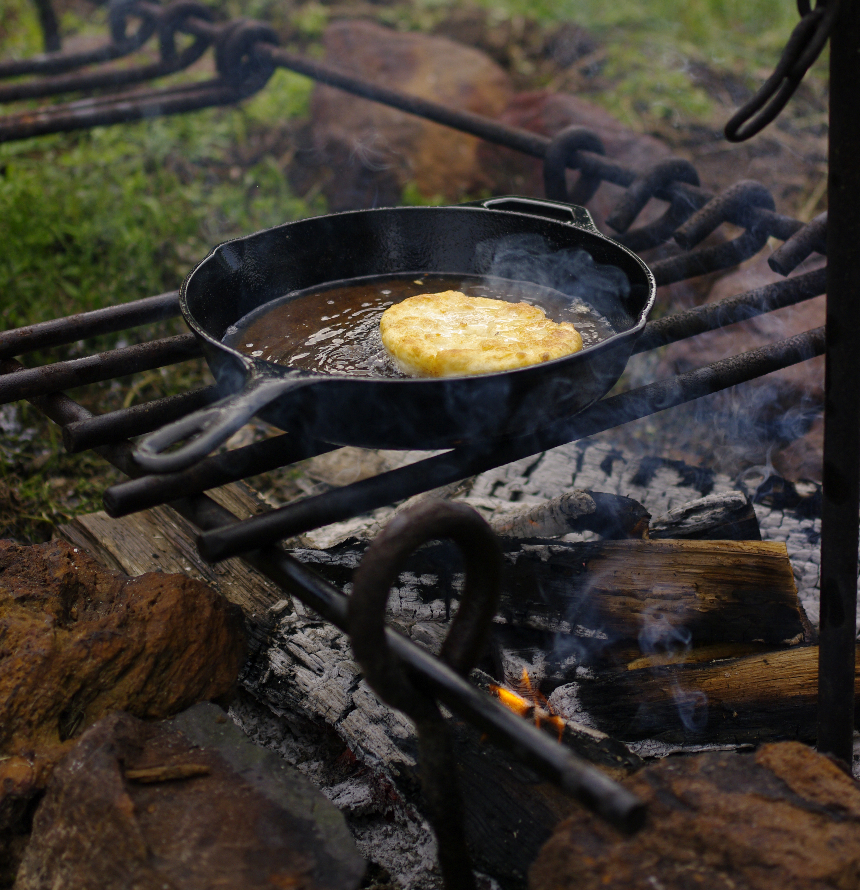 - Heat shortening to at least one inch deep in a heavy iron skillet. Drop disks of dough into the hot shortening and fry until golden. Turn over dough and fry until the other side is golden. The bread should puff up as it fries.
