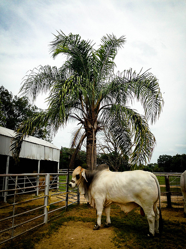First Hudgens came in 1839 – Mississippi – then moved to Hungerford, Texas. Josiah Hudgens – JD Hudgens formed the partnership that continues today. The Hudgens have now incorporated – set up partnerships owned by different members of the family. They do show and sale cattle together – but all livestock carries the Hudgens brand and also the family’s brand. Ranch today is 15,000 acres. 1750 Brahman females – sold to 35 states and 43 countries of the world. When we had the BSE outbreak – all countries stopped buying livestock – now Mexico and Central America have resumed business. Hudgens first exported cattle in 1933 to Australia. Even though they are not shipping live cattle, they still sell semen and some embryos. Bulls are fed Purina Accu-Ration – something to eat 24 hours a day. They run two calving seasons – Spring is March to May – Fall is the end of Aug to October. Spring runs 75 days and the Fall runs 60 days. Manso is the bull that changed the dynamics of the Brahman breed and started it all for the Hudgens.